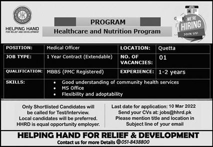 Helping Hand For Relief And Development HHRD jobs advertisement dated about 06 March 2022 in daily Express Newspaper invites application for the vacant post of medical officer in Quetta, quetta Balochistan Pakistan. Preferred Education is Others and MBBS etc.