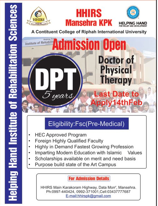 Helping Hand Institute of Rehabilitation Sciences Admission DPT Doctor of Physical Therapy in Mansehra. Last date for submission of admission forms is 14 February 2018. Read newspaper ad for exact details.