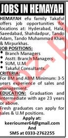 HEMAYAH efu family Takaful requires the services of qualified and target oriented persons for the posts of Branch Manager, Assistant Branch Manager, Unit Manager, Takaful Consultant in Hyderabad, Hala, Saeedabad, Shahdadpur, Tando Adam, Tando Muhammad Khan & Mirpurkhas.