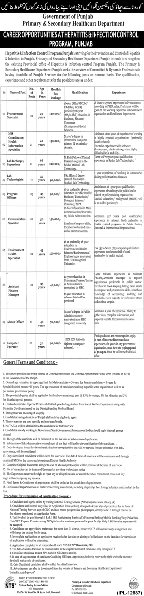 Hepatitis & Infection Control Program Punjab, Pakistan is seeking candidates for the posts of Procurement Specialist, MIS Coordinator, Health Information Specialist, Lab Incharge, Lab Supervisor, Lab Technologist, Program Officer, Communication Specialist, Environment Health Specialist, Assistant Finance Manager, Admin Officer, Computer Operator. NTS application form download given below.