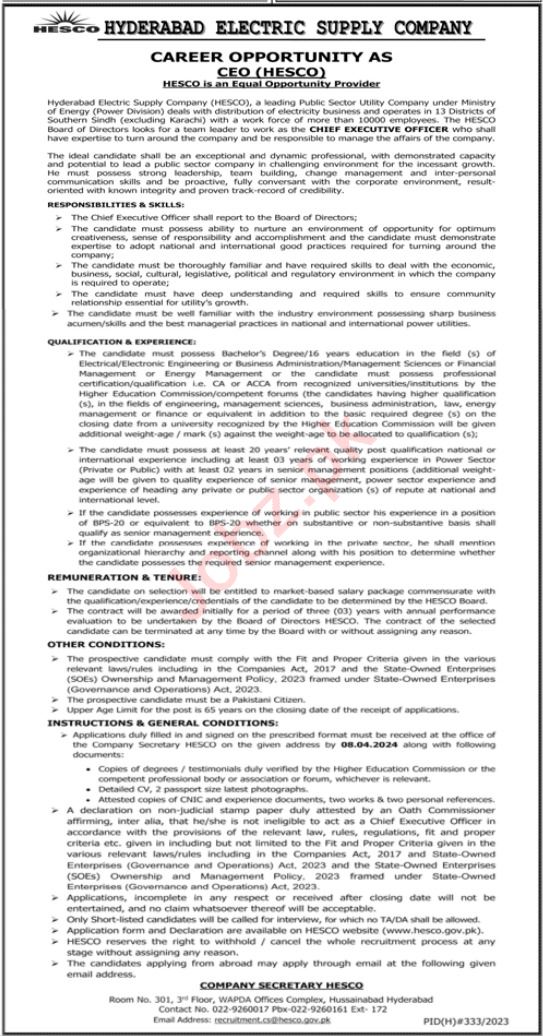 Hyderabad Electric Supply Company HESCO Hyderabad, hyderabad Sindh Pakistan invites applications from eligible candidates for the post of chief executive officer and ceo as per advertisement of March 24, 2024 published in daily Jang Newspaper. Candidates with Bachelor and Master etc. educational background will be preferred.