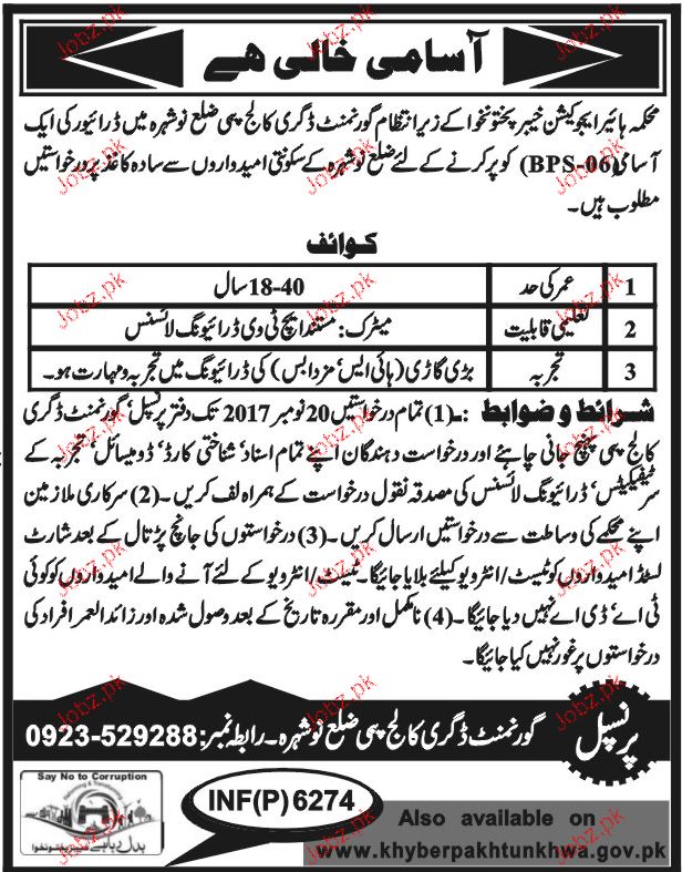 Latest Higher Education Department Driving Posts Nowshera 2025