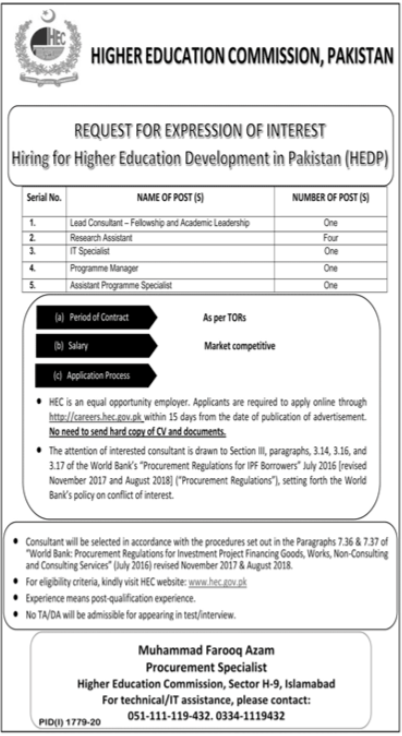 Higher Education Commission HEC is seeking applications from qualified and experienced individuals for the positions of Lead Consultant Fellowship, Lead Consultant Academic Leadership, Research Assistant, IT Specialist, Programme Manager and Assistant Programme Specialist in Islamabad.