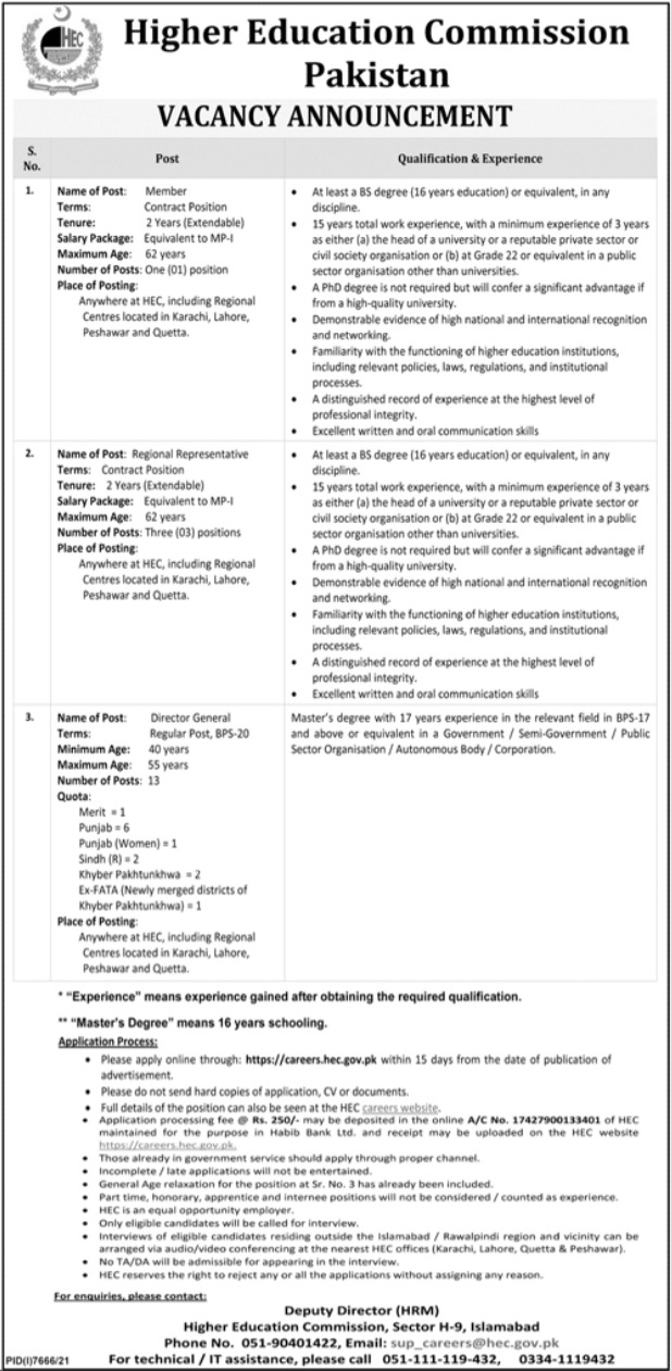 Vacant posts including regional representativer, director general and member are announced in Higher Education Commission HEC Islamabad, islamabad Islamabad Pakistan as per 1 May 2022 advertisement in daily Jang Newspaper. Candidates with Master etc. educational background will be preferred.