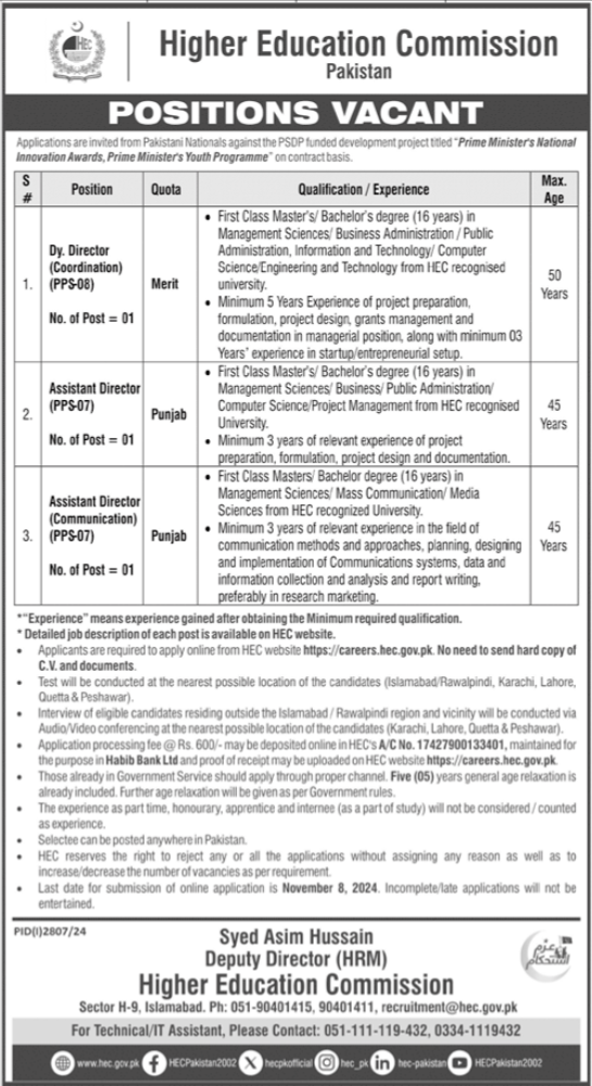 Higher Education Commission HEC Islamabad, islamabad Islamabad Pakistan invites applications from eligible candidates for the post of assistant director communication, deputy director, director, deputy director coordination, director og and assistant director as per advertisement of October 24, 2024 published in daily Jang Newspaper. Preferred Education is Master, MBA, MS, M.sc and Bachelor etc.