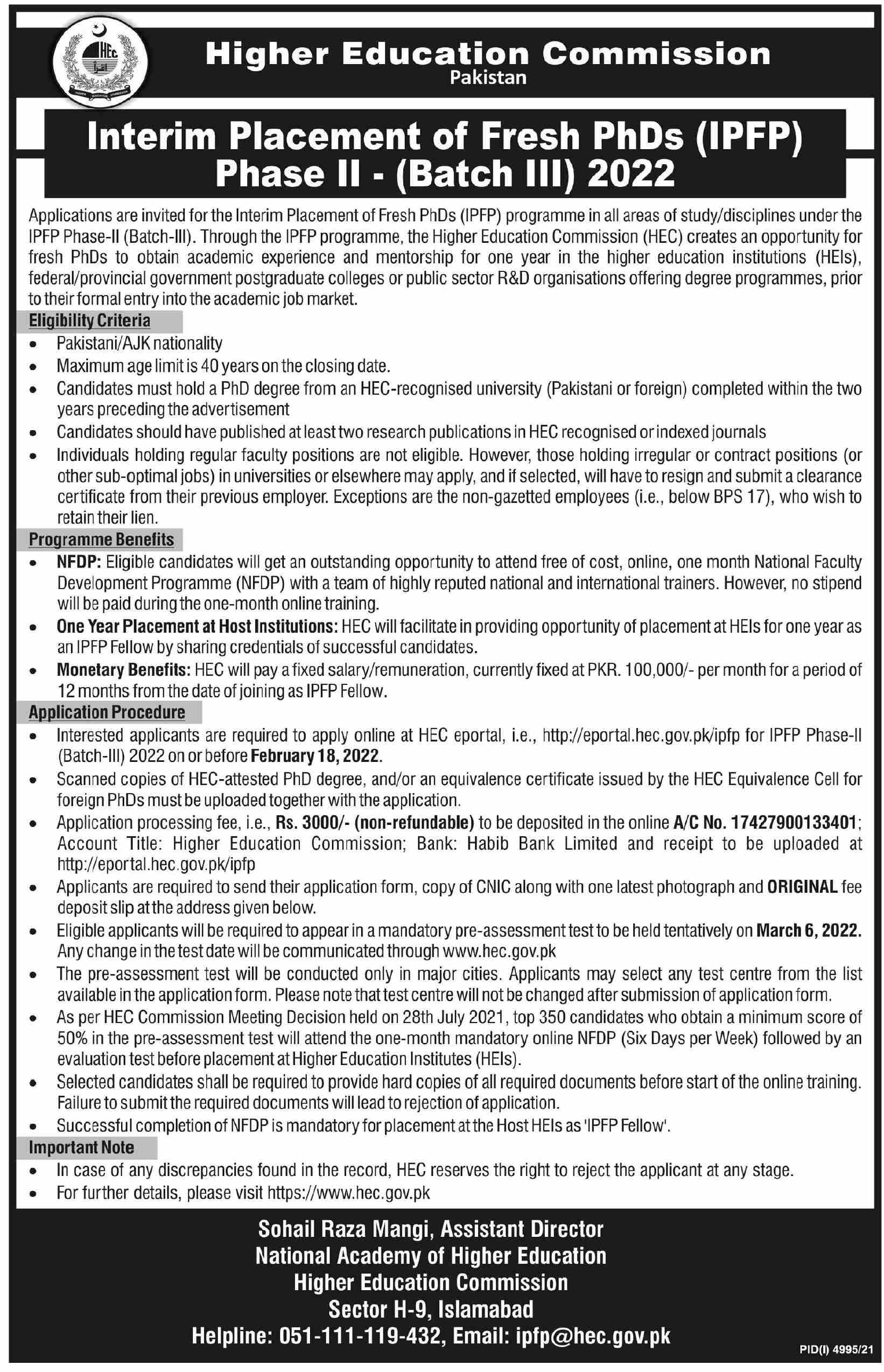 Higher Education Commission HEC Islamabad Pakistan invites applications from eligible candidates for the post of Interim Placement of Fresh PhD and Fresh PhD as per advertisement of January 23, 2022 published in daily Dawn Newspaper. Preferred Education is Phd etc.