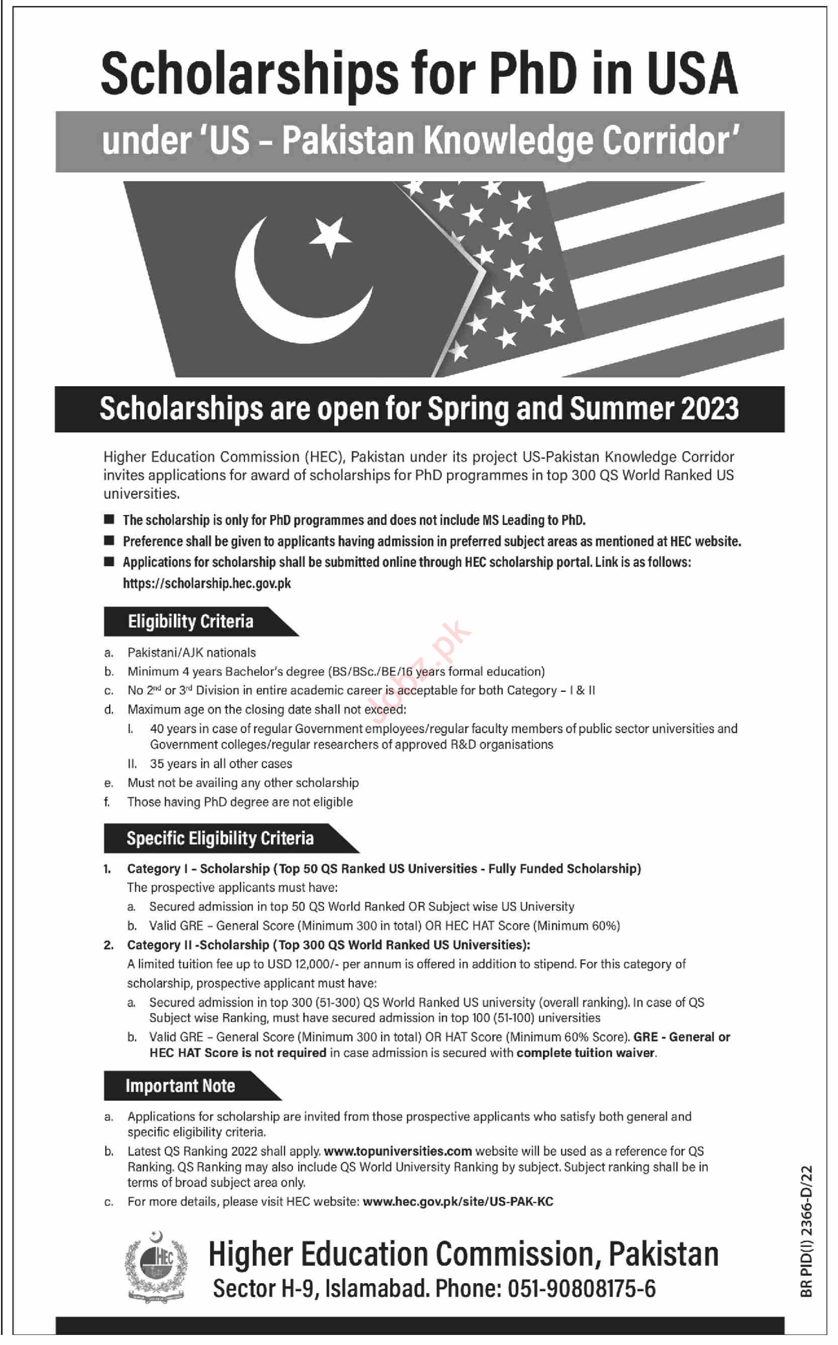 Higher Education Commission HEC Islamabad, islamabad Islamabad Pakistan invites applications from eligible candidates for the post of scholarship as per advertisement of October 17, 2022 published in daily Dawn Newspaper. Persons with Bachelor, MA, Master and M.sc etc. education can apply.
