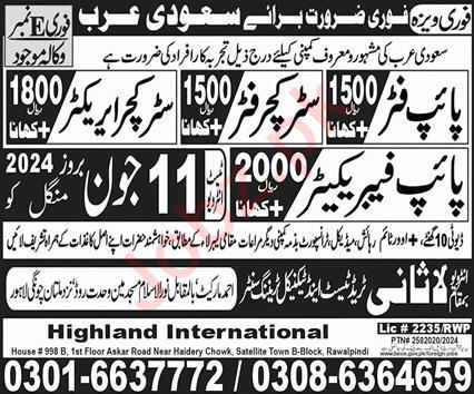 Highland International jobs advertisement dated about 10 June 2024 in daily Express Newspaper invites application for the vacant post of structure fitter, pipe fabricator, pipe fitter and structure erecter in Riyadh, riyadh Saudi Arabia. Middle, Primary and Matric etc. educational qualification will be preferred.