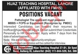 Hijaz Teaching Hospital Jobs 2020 For Pathologist in Lahore