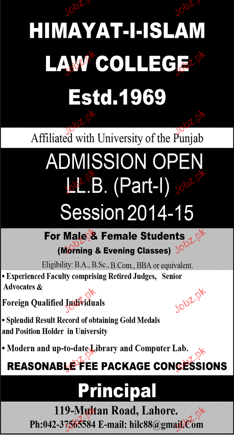 Himayat-i-Islam Law College Admission in LLB in Lahore. Read newspaper ad for exact details.