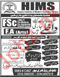 HIMS Hazara Institute of Modern Sciences admissions open for Intermediate , FA Arts & FSc MLT , Pre Medical, Pre Engineering, Computer Sciences in Haripur Khyber Pakhtunkhwa KPK 2018. Read newspaper ad for exact details.