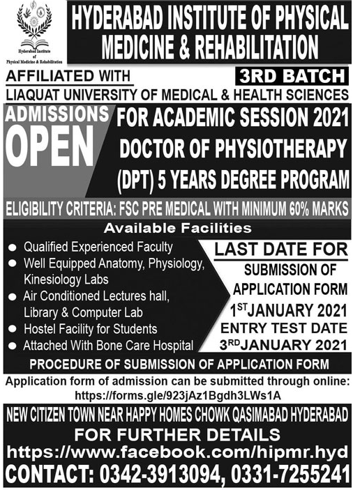 Hyderabad Institute of Physical Medicine & Rehabilitation affiliated with Liaquat University of Medical & Health Sciences has announced admissions in Doctor of Physical Therapy DPT. Read newspaper ad for exact details.