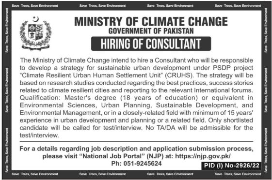 Latest Consultant jobs and others Government jobs in Ministry of Climate Change closing date is around November 26, 2022, see exact from ad. Read complete ad online to know how to apply on latest Ministry of Climate Change job opportunities.