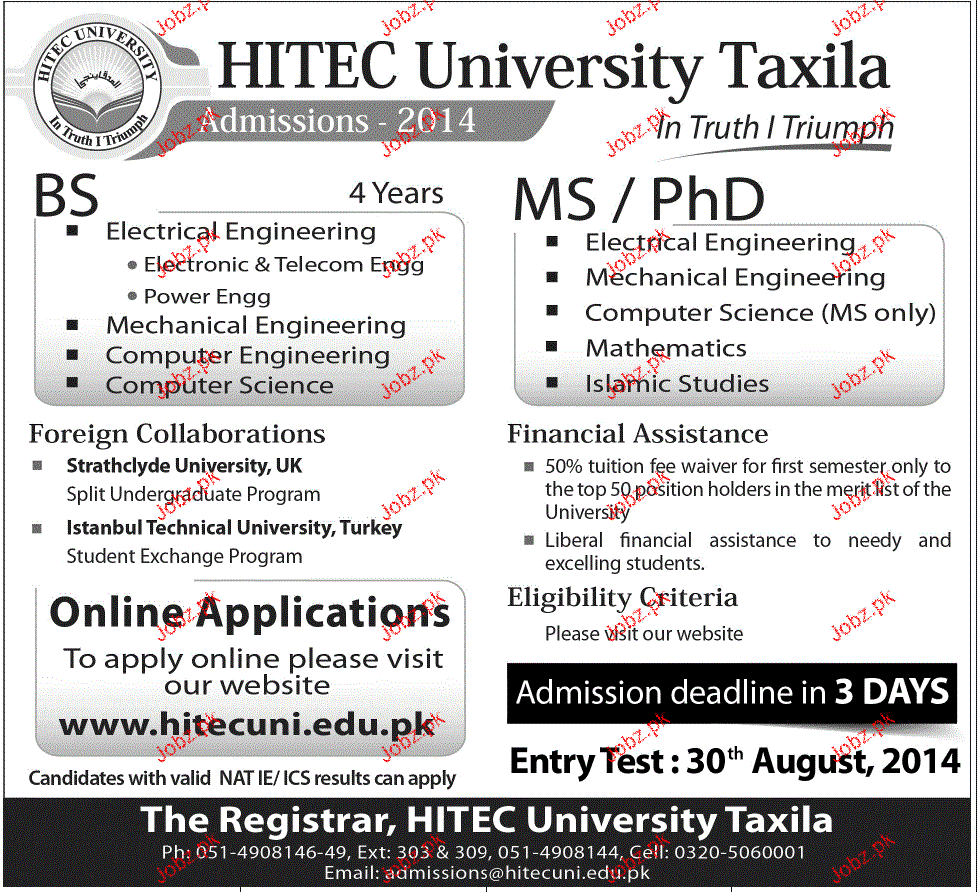 HITEC University Taxila Admission in BS, MS and Phd in Taxila. Read newspaper ad for exact details.