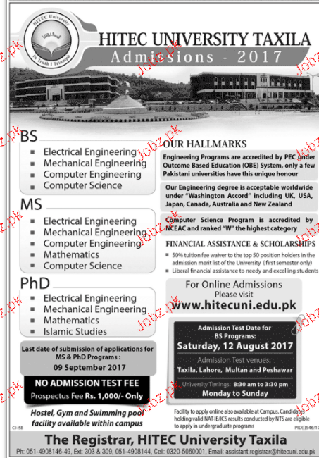 HITEC University Taxila Admission in BS, Phd and MS in Taxila. Read newspaper ad for exact details.