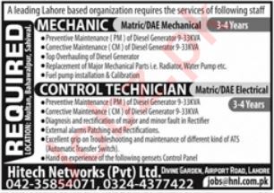 Hitech Networks Pvt Limited jobs advertisement dated about 30 April 2023 in daily Jang Newspaper invites application for the vacant post of control technician and mechanic in Lahore, lahore Punjab Pakistan. Candidates with Intermediate, Middle and Matric etc. educational background will be preferred.
