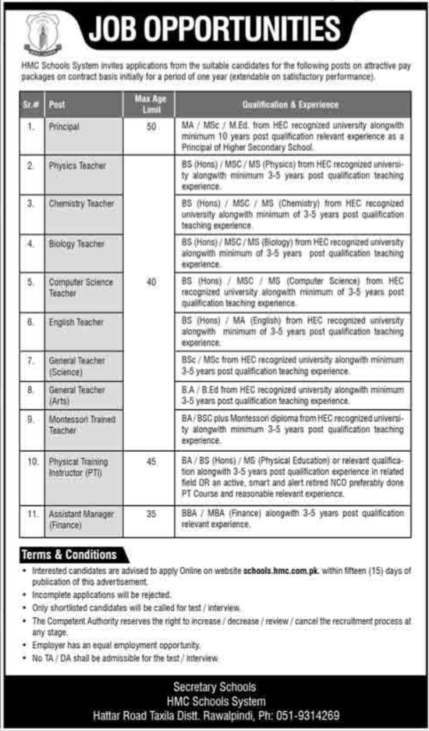 HMC Schools System invites applications from experienced and well educated individuals for the posts of Principal, Physics Teacher, Chemistry Teacher, Biology Teacher, Computer Science Teacher, English Teacher, General Science Teacher, General Arts Teacher, Montessori Trained Teacher, Physical Training Instructor PTI and Assistant Manager Finance in Rawalpindi.