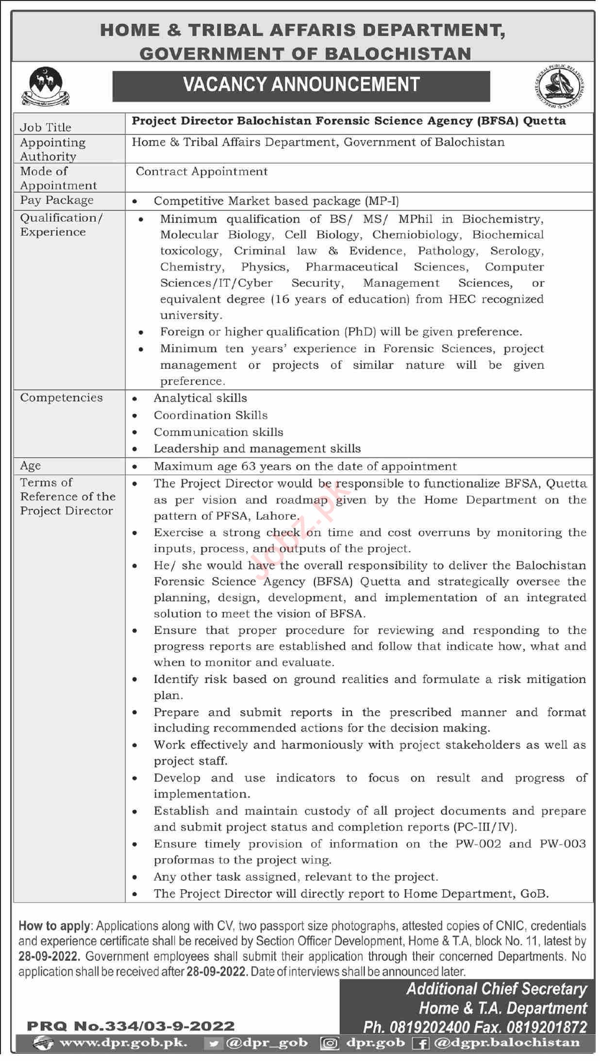 Home and Tribal Affairs Department invites applications for job positions advertised in daily Dawn dated 5 September 2022 for following vacancies in Quetta, quetta Balochistan Pakistan.