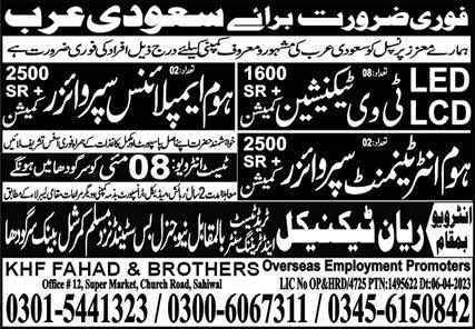 Apply at KHF Fahad & Brothers latest Overseas jobs in Industrial and departments before closing date which is around May 8, 2023 or as per closing date in newspaper ad. Read complete ad online to know how to apply on latest KHF Fahad & Brothers job opportunities. Some jobs in KHF Fahad & Brothers may require skills like Electronics and Manufacturing. Salary varies from 196000. Overtime might be allowed. Free medical, accommodation and transport may be available.