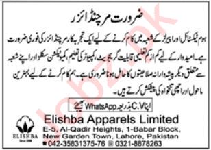 Elishba Apparels Limited Garden Town Lahore, lahore Punjab Pakistan invites applications from eligible candidates for the post of merchandiser as per advertisement of June 22, 2025 published in daily Jang Newspaper. Candidates with Master and Bachelor etc. educational background will be preferred.