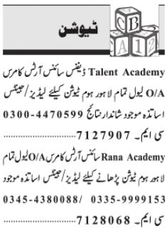 Education jobs advertisement dated about 10 January 2023 in daily Jang Newspaper invites application for the vacant post of home tutor in Lahore, lahore Punjab Pakistan. Candidates with M.sc, BA and MA etc. educational background will be preferred.