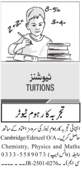 Vacant posts including maths teacher, home tutor, teacher, o level teacher, physics teacher, chemistry teacher and a level teacher are announced in Academy Islamabad, islamabad Islamabad Pakistan as per 9 January 2025 advertisement in daily Jang Newspaper. Preferred Education is Master and Bachelor etc.