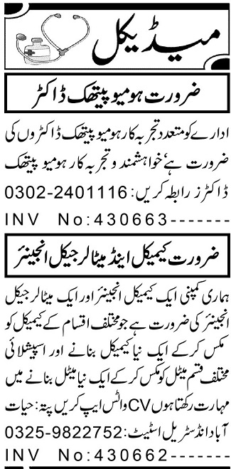 Homeopathic Doctor & Chemical Engineer Jobs 2024