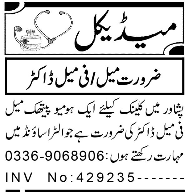 Clinic jobs advertisement dated about 28 February 2024 in daily Aaj Newspaper invites application for the vacant post of homeopathic doctor in Peshawar, peshawar Khyber Pakhtunkhwa KPK Pakistan. Educational qualifications required Others and Master etc.