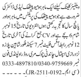 Private Clinic invites applications for job positions advertised in daily Jang dated 8 November 2025 for following vacancies in Chandni Chowk Rawalpindi, rawalpindi Punjab Pakistan.