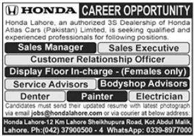 Honda Atlas Cars Pakistan Limited invites applications for job positions advertised in daily The News dated 16 October 2023 for following vacancies in Lahore, lahore Punjab Pakistan.