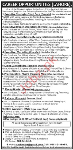 Qualified, medical, health, mbbs, doctors and experienced candidates for the positions of Executive Strategic, Branch Operations Executive, Social Media Executive, Marketing Executive, Client Care Officer, Pharmacist, Receptionist, Trainee and Office Assistant required for Hospital in Lahore.