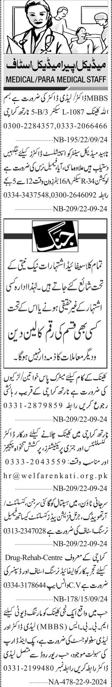 Private Hospital Karachi, karachi Sindh Pakistan invites applications from eligible candidates for the post of lady doctor, gynaecologist, mbbs doctor, masi, dai, general physician, doctor, medical specialist, orthopedic specialist, aya, nurse, dispenser, medical consutlant, female doctor, maid, general practitioner, nursing staff and consultant as per advertisement of October 22, 2024 published in daily Jang Newspaper. Educational qualifications required Others, P.G Diploma, Bachelor, MBBS, Intermediate, Matric and Master etc.