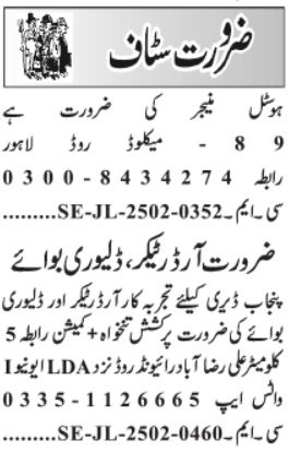 Private Company jobs advertisement dated about 14 February 2025 in daily Jang Newspaper invites application for the vacant post of hostel manager, order taker and delivery boy in Lahore, lahore Punjab Pakistan. Persons with BA, Bachelor, Matric and Intermediate etc. education can apply.