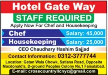 Hotel Gate Way Faisalabad, faisalabad Punjab Pakistan invites applications from eligible candidates for the post of housekeeping and chef as per advertisement of July 6, 2023 published in daily Dunya Newspaper. Middle, Intermediate and Matric etc. educational qualification will be preferred.