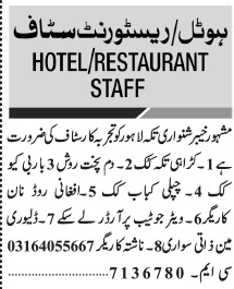 Vacant posts including waiter, delivery man, cook and worker are announced in Hotel Lahore, lahore Punjab Pakistan as per 29 August 2023 advertisement in daily Jang Newspaper. Educational qualifications required Middle, Matric and Intermediate etc.