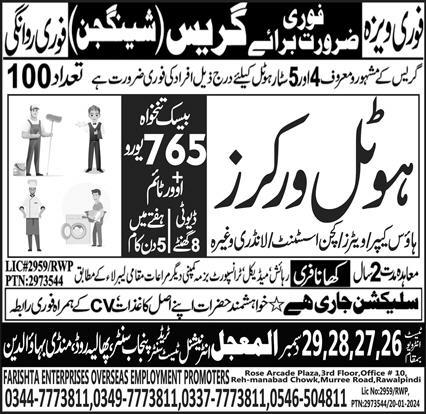 Farishta Enterprises Oversea Employment Promoters is looking for candidates for following posts as per job advertisement published in daily Express Newspaper of December 25, 2024 for location Athens, athens Greece: