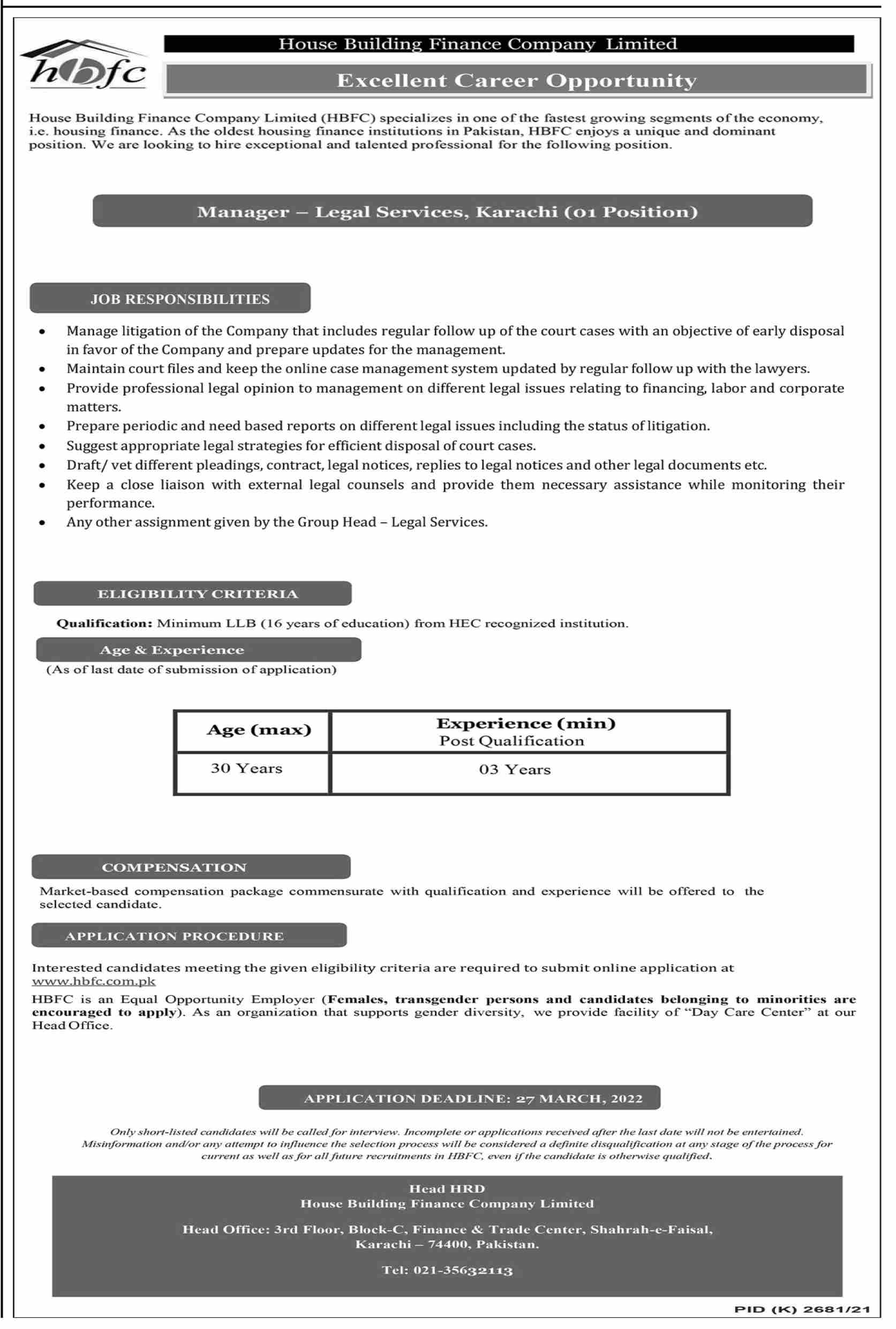 House Building Finance Company Limited HBFCL invites applications for job positions advertised in daily Dawn dated 13 March 2022 for following vacancies in Karachi, karachi Sindh Pakistan.