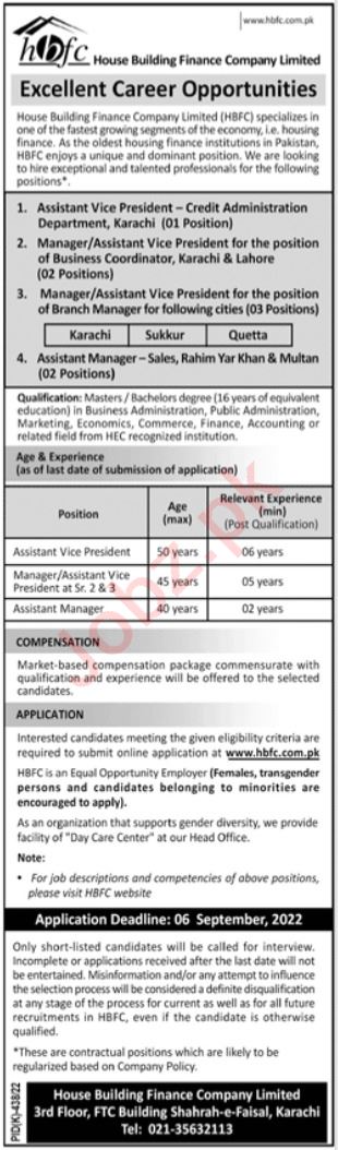House Building Finance Company Limited HBFCL is looking for candidates for following posts as per job advertisement published in daily Jang Newspaper of August 21, 2022 for location Karachi, quetta and sukkur Sindh Pakistan: