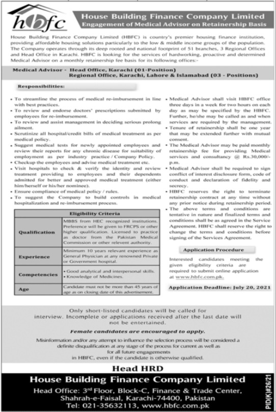 House Building Finance Company Limited HBFCL invites applications from highly educated expert and experienced professional for the post of Medical Advisor in Lahore, Islamabad and Karachi Head Office.