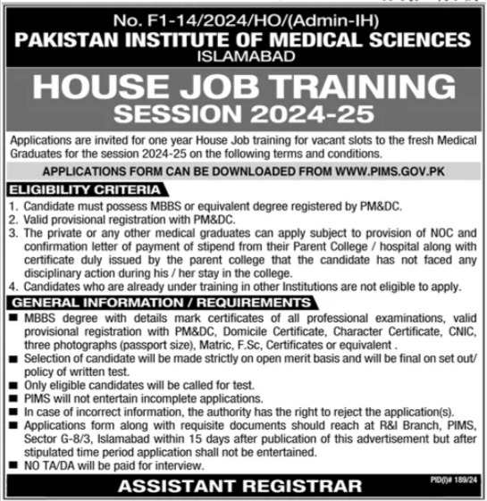 Pakistan Institute of Medical Sciences PIMS is looking for candidates for following posts as per job advertisement published in daily Jang Newspaper of July 10, 2024 for location Islamabad, islamabad Islamabad Pakistan:
