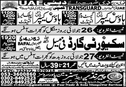 Peer Nazeer & Sons Manpower Services is looking for candidates for following posts as per job advertisement published in daily Express Newspaper of July 20, 2022 for location Abu Dhabi, dubai UAE: