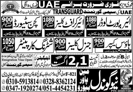 Vacant posts including general cleaner, house keeper, airport loader, kitchen steward, aircraft cleaner and shuttering carpenter are announced in New Gondal Manpower Bureau Abu Dhabi, sharjah UAE as per 1 August 2024 advertisement in daily Express Newspaper. Intermediate, Middle and Matric etc. educational qualification will be preferred.