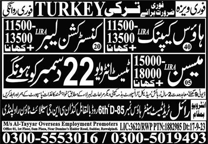 MS Al Tayyar Overseas Employment Promoters invites applications for job positions advertised in daily Express dated 22 December 2023 for following vacancies in Ankara, ankara Turkey.