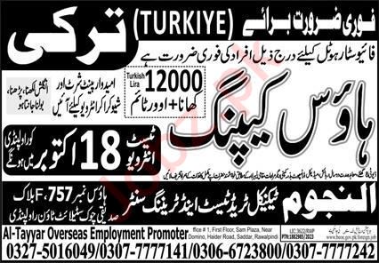 Al Najoom Technical Trade Test Training Center jobs advertisement dated about 1 October 2023 in daily Express Newspaper invites application for the vacant post of house keeping in Istanbul, istanbul Turkey. Middle and Primary etc. educational qualification will be preferred.