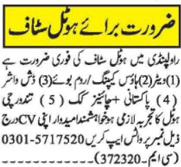 Vacant posts including dishwasher, cook, house keeping supervisor, tandoorchi, house keeping staff, waiter, chinese cook and room boy are announced in Hotel Rawalpindi, rawalpindi Punjab Pakistan as per 6 July 2023 advertisement in daily Jang Newspaper. Matric, Middle, Bachelor, Intermediate and BA etc. educational qualification will be preferred.