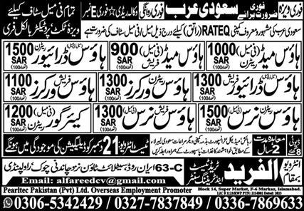 Pearltec Pakistan Private Limited Riyadh, riyadh Saudi Arabia invites applications from eligible candidates for the post of Female House Maid Fresh, House Nurse Return, Female Care Giver, House Driver Return, House Driver Fresh, House Worker Return, House Worker Fresh, House Nurse Fresh and Female House Maid Return as per advertisement of December 19, 2023 published in daily Express Newspaper. Persons with Intermediate, Matric and Middle etc. education can apply.