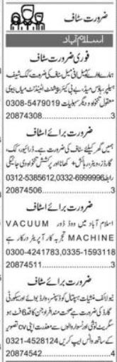Private jobs advertisement dated about 20 October 2022 in daily Express Newspaper invites application for the vacant post of house maid, cook, security guard, ward boy, baby sitter, waiter, patient attendant, chef, helper, guard, driver, vacuum machine operator and dispenser in Islamabad, islamabad Islamabad Pakistan. Persons with Middle, Matric, Intermediate and Primary etc. education can apply.