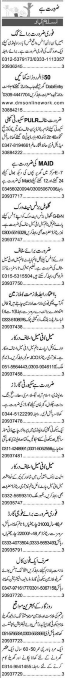 Vacant posts including house maid, house servant, supervisor, jco, insurance agent, receptionist, security staff, office staff, chowkidar, electrician, fauji guard, maid, female office staff, security guard, data entry operator, cook, office boy and driver are announced in Private Company Islamabad, taxila, chakwal, rawalpindi, murree, hattar, gujar khan and fateh jang Islamabad Pakistan as per 28 June 2024 advertisement in daily Express Newspaper. BA, Middle, Bachelor, Intermediate and Matric etc. educational qualification will be preferred.