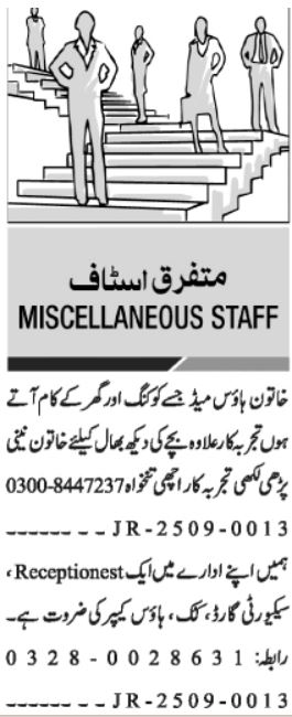 Vacant posts including security guard, cook, nanny, receptionist, house maid and housekeeper are announced in Private Company Islamabad, islamabad Islamabad Pakistan as per 2 September 2025 advertisement in daily Jang Newspaper. Intermediate, Bachelor, Middle, Matric and BA etc. educational qualification will be preferred.