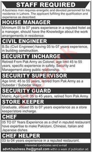 House jobs advertisement dated about 2 April 2023 in daily Jang Newspaper invites application for the vacant post of security supervisor, store keeper, security incharge, civil engineer, chef helper, house manager, chef and security guard in Lahore, lahore Punjab Pakistan. Educational qualifications required Primary, Middle, Intermediate and Matric etc.